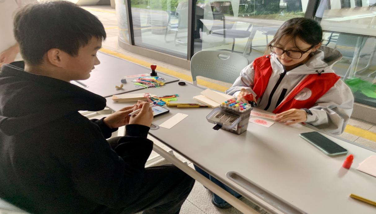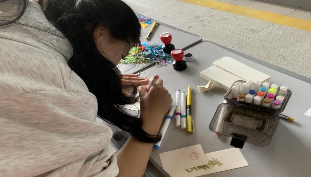 活动伊始,现场的活动摊位便被同学们层层围住。在“诗意书签”创作环节,同学们认真将与“霜降”相关的经典诗句、散文片段倾注于笔尖。一张张承载着文化底蕴与青春创意的书签,化作传承传统文化的小小载体,加深同学们对节气文化内涵的理解。