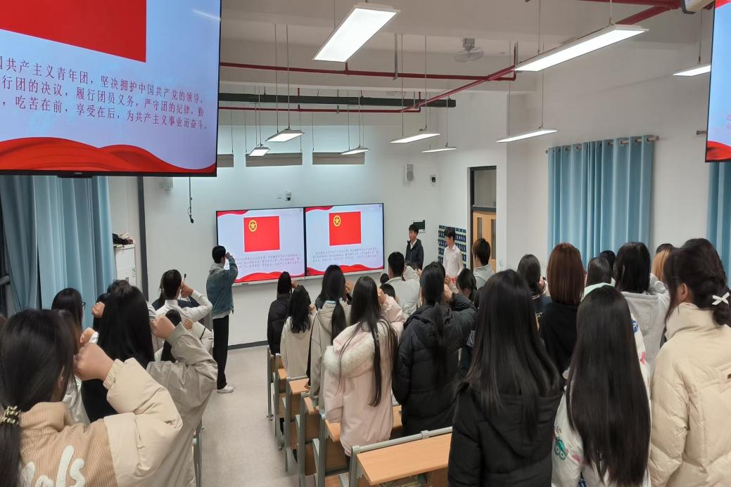 大会最后,团总支书记陈伟成老师带领全体参会团员面向团旗重温入团誓词。鲜红的团旗醒目展开,团员们以洪亮坚定的声音念出誓词,字句铿锵间既是对年度理论学习与工作实践的复盘,也是对践行五四精神、落实全会部署的庄严承诺。誓词声落,团员们的初心使命愈发坚定,大会"总结工作、查摆问题、凝聚力量"的核心主旨也落地生根。这场庄严宣誓更激励着乡旅团学骨干扎实推进团支部建设,为本次乡旅学院团总支2025年度团组织生活会画上了圆满且意义深远的句号。