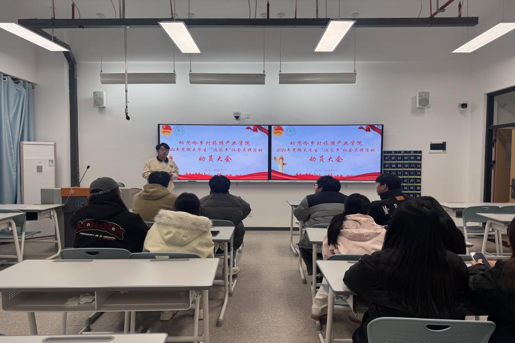 1月8日,相思岭乡村旅游产业学院2026年寒假大学生“返家乡”社会实践活动动员大会在动科大楼507教室顺利召开。大会由校团总支书记陈伟成老师主讲,旨在引导青年学子扎根家乡热土,在实践中受教育、长才干、作贡献。