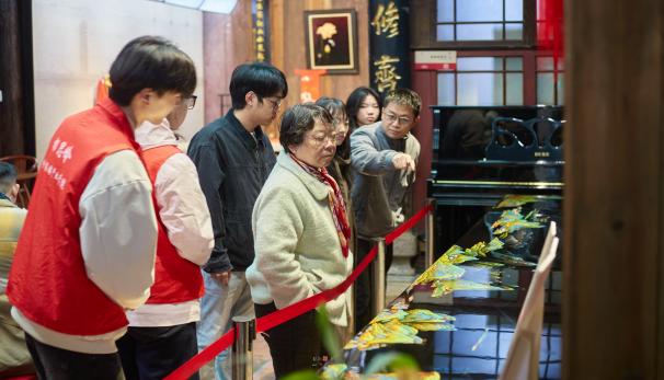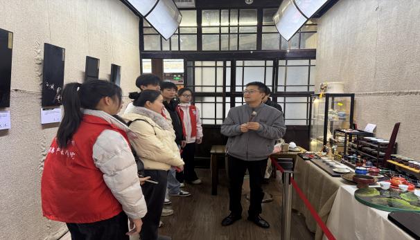实践首站,实践团成员走进李世甲故居,探访国家级非物质文化遗产福州脱胎漆器。相思岭乡村旅游产业学院院长郑宗沧老师亲自带队讲解,为学子们打开了了解漆艺文化的大门。郑宗沧老师结合展品细节,细致拆解了脱胎漆器“木胎成型、髹漆成器、描金出彩”的复杂工序,从制胎时的精雕细琢到髹漆时的反复叠加,从打磨时的耐心细致到装饰时的巧思妙想,每一个环节都让学子们深刻体会到“千磨万击还坚劲”的匠人执着。当亲手触摸漆画表面温润如玉的质感,感受彩漆与螺钿交相辉映的光泽,成员们直观领略到木质肌理与传统漆艺碰撞出的独特魅力。结合郑宗沧老师讲述的李世甲先生与福州漆艺的渊源故事,大家更读懂了福州匠人“守艺一生”的坚守背后,那份融于技艺中的家国情怀与文化自信。